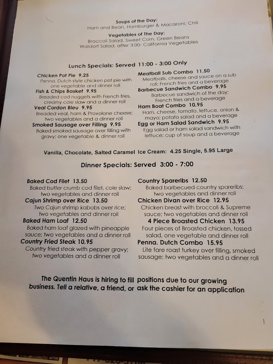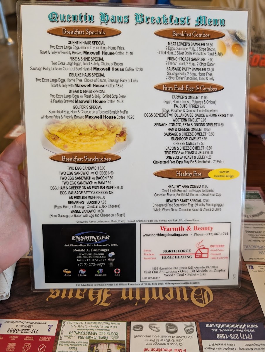 Quentin Haus offers a straightforward, comforting menu that feels right at home in a family-friendly, casual setting. The focus is on hearty, familiar dishes that bring a sense of ease to breakfast, lunch, or dinner gatherings. Whether you’re starting your day with a warm Belgian waffle topped with fresh fruit or settling in for a comforting hot roast beef sandwich, the menu reflects a classic American diner spirit with subtle Pennsylvania Dutch influences.